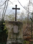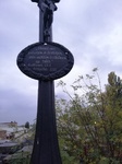 A kereszt talapzatán van olvasható felirat, de a kereszt egy viszonylag nagy, gondozott virágágyás közepén áll és a virágok eltakarják a feliratot.