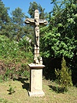 Eléggé újnak kinéző, sok szoborral díszített kereszt.