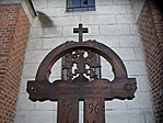 Szép, népi motívumokkal díszített fakereszt az evangélikus templom előtt.