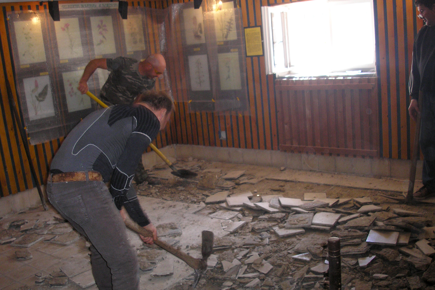 A járólapok és a beton feltörését, a falak menti árkok kiásását, a kiásott föld elszállítását és más, szakértelmet nem igénylő munkákat a múzeumi dolgozók és a múzeumi baráti kör tagjai végezték. Egy műemlékes építész barátom tanácsára a falak menti árkokba a föld helyére kőréteget helyeztünk, így szellőzhet az alapozás. A kőréteg valójában a feltört betondarabokból állt. Így nem kellett sem kőanyagra költenünk, sem a bontási törmelék elszállításáért százezreket fizetnünk. A falak mellől kitermelt földet a 22 éves személyautóm után kapcsolt kölcsönkért utánfutóval vittük el az egyik teremőrünk faluszéli telkére, ahol ingyen lerakhattuk.
