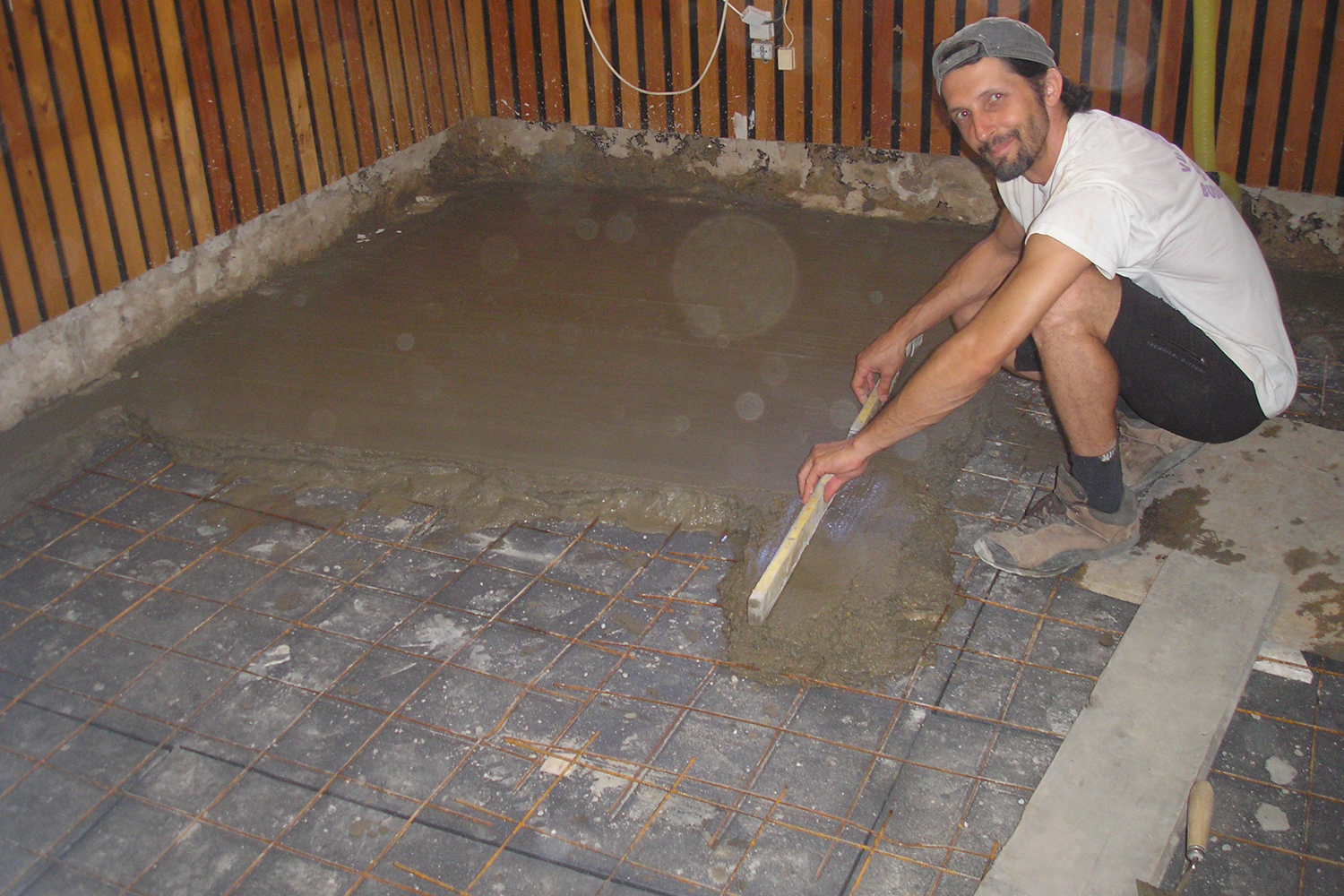 Az új betonréteg simítását a tervek szerint társadalmi munkaként a nyugdíjas kőműves apósom végezte volna úgy, hogy öcsém és én keverjük és talicskázzuk a betont. Ez több százezer forinttal olcsóbb lett volna, mint a piaci ár. Sajnos egy szoba lebetonozása után apósom hirtelen kórházba került. Mást nem tehettem, én léptem a helyébe. Régészként ilyen munkát még nem csináltam, az első helyiségek felületére nem vagyok büszke, de a végén már kevesebbet hibáztam. A lapozást viszont már burkolóval végeztettük. Kivétel az iroda, amit ifj. Virág Sándor (a Ninja Warrior döntős helyezettje) simított és aztán ő is lapozta. A baráti körünk tagjaként így támogatta a múzeumot. Édesapja lakatos, ő az apósomtól kölcsönkapott öreg betonkeverőt segített megjavítani.