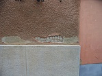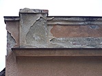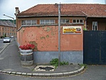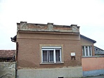 A magas kőkerítésről elég csúnyán hámlik a vakolat, de az épület lábazatán és a tetőzetből kiugró oromfalon is ugyanez látszik.