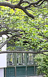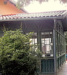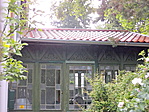 Jó állapotú veranda, faragott díszítéssel, üvegbetétekkel.