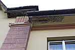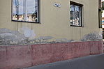 Vakolata a lábazat fölött több helyen erősen kopik. Eresze alatt beázásnyomok láthatók.