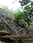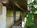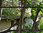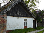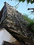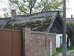 Nagyon elhanyagolt romló ház, gondozatlan kertben. A tetőn fű nő.