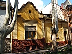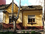 Jó állapotú sárga épület, alját vörös kőmozaik díszíti.