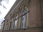Átlagosan jó állapotú épület, kopott falfestéssel és a lábazatnál hulló vakolattal.