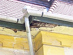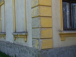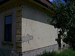Sajnos a tér felőli oldalon nem túl szép az épület, ott jókora málló vakolatfoltok vannak, javítást csak a bejárat felőli oldalon láttam. A tető az egyik sarokban áztatja a felső párkányt.