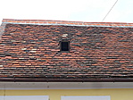 Elfelezett ház. Mindkét oldal jó állapotú, de eltérő színűre festette a két tulajdonos. A tető cserepei különfélék, de az állapota jó.