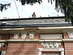 Az eresz alatt több helyen, és a lábazaton is több helyen tégláig hiányzik a vakolat.