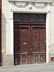 Szép régi kapu, épületdíszek. Tetőablakok a tető síkjában.