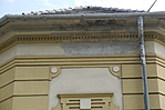 Eresze alatt beázásnyom van, de láthatóan javították. Néhány kisebb vakolathiba fedezhető fel az épületen.