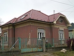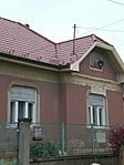 Kicsit elhanyagoltnak tűnik az amúgy szép formavilágú ház, a homlokzat néhány helyen repedezett.