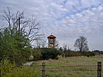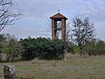 A templomból már csak a torony van meg, kerítés és zárt kapu védi a területet.