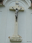 Érdekes megoldás, egy épület, a régi iskola falára helyezték el a keresztet.