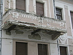 Az épület erkélyéről a vakolat rendkívülien hullik és több helyen is foltokban hiányzik.
