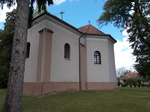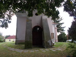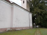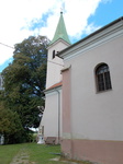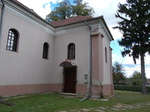 D-i homlokzathoz a hajóval azonos magasságú sekrestye tömege csatlakozik, sarkain falpillérek. A sekrestye D-i és NY-i homlokzatán a hajó ablakaival megegyező; félköríves ablakok nyílnak, NY-i oldalán előtetős ajtó. A hajó D-i homlokzata két tengelyében ablak.