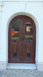A főhomlokzatán ion fejezetes pilasztetek közt szalagketeres, záróköves, félkörívzáródású ajtó nyílik. Sima párkány felett egyszerű oromzat, felette kőkereszt. A homlokzat élei lekerekítetten élszedettek.