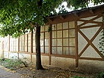 Az udvaron álló műterem hátsó falával a szomszédos házzal érintkezik, két oldalán szabadon álló, nyújtott téglány alprajzú, ÉNy-i sarkán rövid, előreugró kis szárnnyal bővített építmény. A főépületen félnyeregtető, közepén nagyfelületű üvegtáblákból álló üvegtetővel, az oldalszárnyon nyeregtető. Favázas szerkezet, vakolatlan, a szerkezet közeit tégla tölti ki. A főépület Ny-i homlokzatát 10 álló gerenda osztja egyenetlen tengelyekre, vízszintes gerendák pedig 3 sávra tagolják. A homlokzat teljes szélességén a felső gerenda fölött kis fa konzolok sora tartja a tetőzetet. Az oldalszárny Ny-i homlokzata oromzatos, felületét gerendák osztják háromszor három mezőre. Oldalhomlokzata 3 tengelyes, középen új ajtó. A D-i oldalhomlokzat szintén favázas, utólag vakolt, ablakokkal áttört.