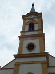 A torony három részre tagolt, négy szintet foglal magában. Alsó része dór pilaszterekkel keretezett, háromrészes dór párkány zárja. Földszintjén kőkeretes, zárókődíszes, szemöldökgyámos kapu, felette háromszögű, tagozott timpanon, a karzatszinten nyújtott arányú, szalagkeretes, váll- és zárókődíszes ablak. A torony egyszerű párkánnyal zárt második része falsávokkal keretezett, ovális, szalagkeretes padlásablakkal áttört. A torony felső része párkánnyal összekötött oszlopszékeken nyugvó toszkán pilaszterekkel keretezett, háromrészes órapárkányal zárt, félköríves harangablakokkal áttört, melyek fölött szokatlanul széles, három részre osztott, váll- és zárókődíszes íves szemöldök ül. A tagozott toronysisakon 1903-as, a sisakcsere időpontját jelző felirat, tetején gomb, zászló, csillag.