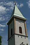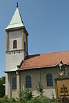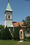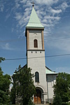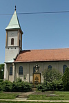 A templom téglalap alaprajzú, négyszögletes tornya a homlokzat síkjából félig előrelép, törtvonalú bádogsisak fedi. Enyhén bemélyülő félköríves bejárata felett félköríves kórusablak, a torony felső szintjének három oldalán szögletes harangablakok vannak. A templom két oldalát tagoló lizénák között 7-7 félköríves ablak van, a hátralépő nyújtott szentély a nyolcszög három oldalával zárul, hasonló ablakokkal. A hajótest cseréppel fedett, eresze alatt egyszerű tagozat fut végigkoronázópárkányként. Az épület kívül tagozataival együtt szürkére vakolt .