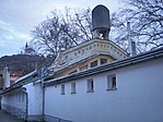 A téglalap alaprajzú kis kétszintes, magastetős épület inkább csak földszintesnek hat, alsó szintje félig a terepszint alatt van.