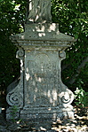 Volutákkal díszített, feliratos talapzaton álló Nepomuki Szent János-szobor, 1818.