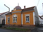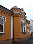 Kitűnő állapotú, szépen felújított narancs épület fehér díszekkel, az utca egyik ,,ékköve''.