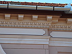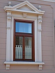 "A copf stílusra jellemző elemekkel díszítették 1+2+1 tengelyű, rizalitokkal tagolt homlokzatát. Erősen tagozott főpárkányát gyámkövek, ökörszemek, kagyéldíszek gazdagítják."