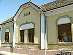 Felújított épület, salétromos a lábazat felett.