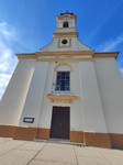 Templom főhomlokzatának szélső szakaszai dísztelenek, tagolatlanok, profilozott párkánnyal zártak. Kis mértékben előrelépő középszakasz alsó szintjét háromrészes párkányzattal zárt két széles lizéna fogja közre; párkányzat képszékében "AVE MARIA" felirat. Lizénák közében lent szalagkeretes kapu konzolok tartotta profilozott egyenes szemöldökpárkánnyal; konzolok közében "1815" évszám. Kapu fölött egyenes záradékú, félköríves szalagkeretű ablak váll- és zárkővel, ablakzáradék fölött lunettával. Alsó toronyszint alatt középső szakaszán előrelépő attika. Alsó toronyszint két oldalán egy-egy homorú ívű, lemezprofilos peremű támfal. Alsó toronyszint szalagkeretes homlokzati mezejében szalagkeret felső eleméhez tapadó kiülő tükörben álló ovális alakú szalagkeretes ablak zsalugáterrel. Alsó toronyszintet háromrészes, alsó és felső elemén lemezprofilú párkány zárja. Felső toronyszinten kettős lábazati sáv fölött lemezprofilú övpárkányon oldalanként egy-egy kiülő tükörre ültetett, félköríves záradékú szalagkeretes, toszkán jellegű váll- és zárköves ablak ül. Kiülő tükör és ablakkeret lábazatos; az ablak toszkán jellegű vállkövei a kiülő tükrön is megjelennek. Torony felső szintjét háromrészes órapárkány zárja, mely párkány alsó eleme a toronyoldalak kiülő tükreinél golyvázódik. Órapárkány felső eleme gazdag profilozású. Négyzetes sisak alsó eleme homorú vonalú gúlára fűzött párnatag, középső eleme négyzetes toronytest oldalain timpanonnal zárt diadalív motívummal, felső eleme négyzetes testen lévő gúla; sisakcsúcson gömb latinkereszttel.