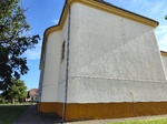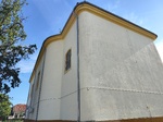 Templom jobb oldalhomlokzatán karzatszakaszon egymás fölött két szegmensíves záradékú szalagkeretes ablak; hajószakaszon két, szentélyen egy darab szegmensíves záradékú szalagkeretes ablak. Hajó szentély felé eső sarkai, valamint egyenes záradékú keskenyebb szentély sarkai íveltek. Hajón és szentélyen körülfutó profilozott zárópárkány. Hajón nyereg-, szentélyen és sekrestyén kontyolt tető.