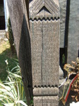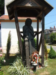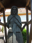 Meglepően nagy méretű faszobor egy védőtető alatt, mellette kopjafa a helyi háborús hősök névsorával: