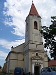 Egyhajós, félköríves szentélyzáródású templom, a főhomlokzat előtt álló toronnyal.