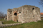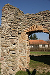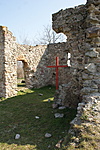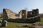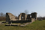 Egyhajós, egyenes szentélyzáródású templom romjai.