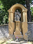 A kastély kerítésfalából kiemelkedő fülkében álló kőemlék mészfestéssel. Újabb (vagy átalakított) posztamensen térdelő(?) Nepumuki Szt. János karingben, palásttal, biritummal, kezében kereszt. Jobb oldalánál a posztamensen töredékes angyal alak.