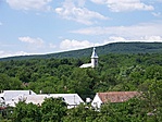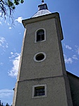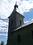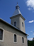A falu szélén, dombtetőn, szabadon áltó, kelet-nyugati tengelyű, téglány alaprajzú épület, keleti oldalán négyzetes alaprajzú toronnyal. A templom kontyolt nyeregtetejét és a torony többszörösen törtvonalú gúlasisakját fémlemez fedi. A templom és a torony keleti sarkai élszedettek, körben cementes lábazat fut. A templomon nincs párkány, a tornyot viszont gazdagon tagozott párkány koronázza. A templom bejárata a nyugati oldalon nyílik. Itt a homlokzat tengelyében szemöldökgyámos megoldású, szegmentíves záradékú, kőkeretes ajtó áll. A kőkeret külső széleit sekély karc kíséri. A szemöldökkövön az építtető neve és az építés évszáma olvasható. A templom északi és déli homlokzatán egyaránt négy-négy, vakolt szalagkeretes, szegmentíves záradékú ablak nyílik. A torony déli oldalán füles kőkeretes, szemöldökgyámos megoldású ajtó található. A szemöldökkőben zárókő imitáció, benne homorúan lekerekített sarkú, négyzetes mező. A torony keleti oldalán, a karzatszinten egy közel négyzetes formájú, szegmentíves záradékú, vakolt szalagkeretes, felette pedig egy fekvő ovális alakú, ugyancsak vakolt szalagkeretes ablak nyílik. A torony külső falsíkjai a karzatszint felett visszaugranak. A harangszinten oldalanként egy-egy félkörívesen záródó, vakolt szalagkeretes ablak található.