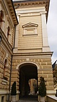 Az udvari homlokzatokon keretezett zárköves, szegmensíves alakok, közöttük páros lizénasávok töltik ki a falfelületet.