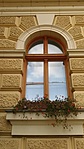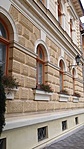 A rizalit mellett 4-4 tengelyes oldalszárnyak: a földszint szintjén kváderes, az emeletválasztó párkány fölött végigfutó könyöklőpárkány, félkörívesen záródó aediculás ablakok, a sarkokon kettős kvádersor.