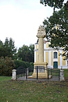A római katolikus templom előtti téren, alacsony kovácsoltvas kerítéssel övezetten szabadon álló Szentháromság szoborcsoport. Talapzata csonkagúlán emelkedő dór oszlop. A talapzat alján felirattal.