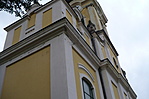 A torony íves párkánnyal kapcsolódik a hajóhoz, a széleken vázák állnak. Az oromzatban fekvőovál ablak. A törtívű órapárkány alatt minden oldalon félköríves, vakolatkeretezett ablakok nyílnak.