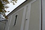 A déli homlokzat nyugati végén toronyfeljáró, felette három, állóovál, vakolatkeretezett világítóablak. A hajón ettől keletre fenn két szegmentíves, szalagkeretes ablak, a keleti alatt ajtó látható.