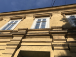 A kéttengelyes rizalitok alsó zónája, falsávos falpilléreinek fejezetei tojássorosak, az emeletiek Colosseum-motívumosak, lunettás. A középső tengelyben álló kapubejáró kiemelt, ugyancsak egyenes záródású, falpillértagos.