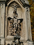 A magas lábazaton álló szobor három oldalának építészeti kialakítása megegyezik: a három szintre osztott egyes oldalak széleit háromrészes támpillérek keretezik, a támpillérek két felső szakaszát fülkés kialakítás élénkíti, felső szakaszát fiatorony zárja. A támpillérek közti falszakaszok alsó szintje vízszintes párkánnyal osztott, legfelső szintje háromszögű pergolával záródik egy csúcsíves fülke fölött. A három oldal összekapcsolódásánál a sarok mélyének ürességét kis oszlop ellensúlyozza. A három oldal összezáródása felett kis torony emelkedik, tagozott teste felett kis kereszt.