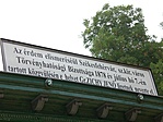 A lapos ívű tető csúcsán kis rúdra szerelt két zászlón áttört évszámok: 1879, 1990. A tető déli oldalán attikaszerű feliratos tábla: