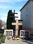 Mellette látható egy világháborús emlékmű és egy milleniumi kereszt, szemben egy Szent Flóriánt és Lőrincet ábrázoló emlékoszlop.