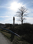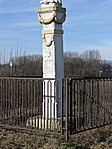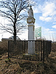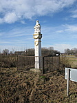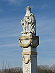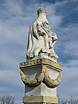 Mállott, rosszul javított szobor, kb. ép talapzaton.