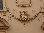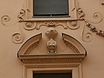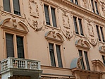 A vadász utcai homlokzat első tengelyének emeleti nyílásai helyén az 1. 2. Emeletet átfogó gazdag stukkódísz van középen az építészetet szimbolizáló emblémával. Felette a 3. Emeleten az építkezés évszáma római számokkal.
