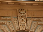 Az épület sarkán az 1. Emelet magasságában aranyozott gömböt tartó fél akt szobor áll.
