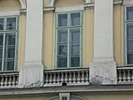 A József Nádor téri homlokzat jobb állapotú, a József Attila utcai viszont elkeserítő, porlepte. A tympanon alatt még látható az egykori Postabank-felirat.